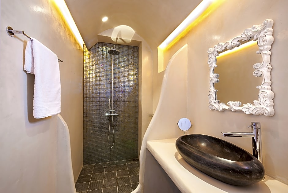 The Maisonette Suite features luxurious, living spaces across two levels and features a private balcony with Aegean sea, Caldera and Volcano views. Other facilities include an outdoor hot tub and sun loungers. Featuring a king size bed with designer linen and the signature ‘Secret’ mattress, the bedroom is located on the lower floor while the living area is found on the second, separated by a luxurious forged cement stairway, and opens out to a private balcony. The bathroom is built-in in the traditional local style but embellished with luxurious elements throughout.